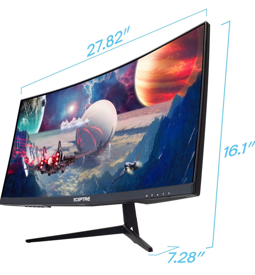 - 30" Curved Gaming Monitor 2560 x 1080 Full HD Resolution. Response Time- 5ms GTG.Aspect Ratio: 21:9. Viewing Angle is 170° (H) / 170° (V). Brightness(typ) is 250. Without Stand (W x H x D)-27.82 x 12.64 x 3.69 inches